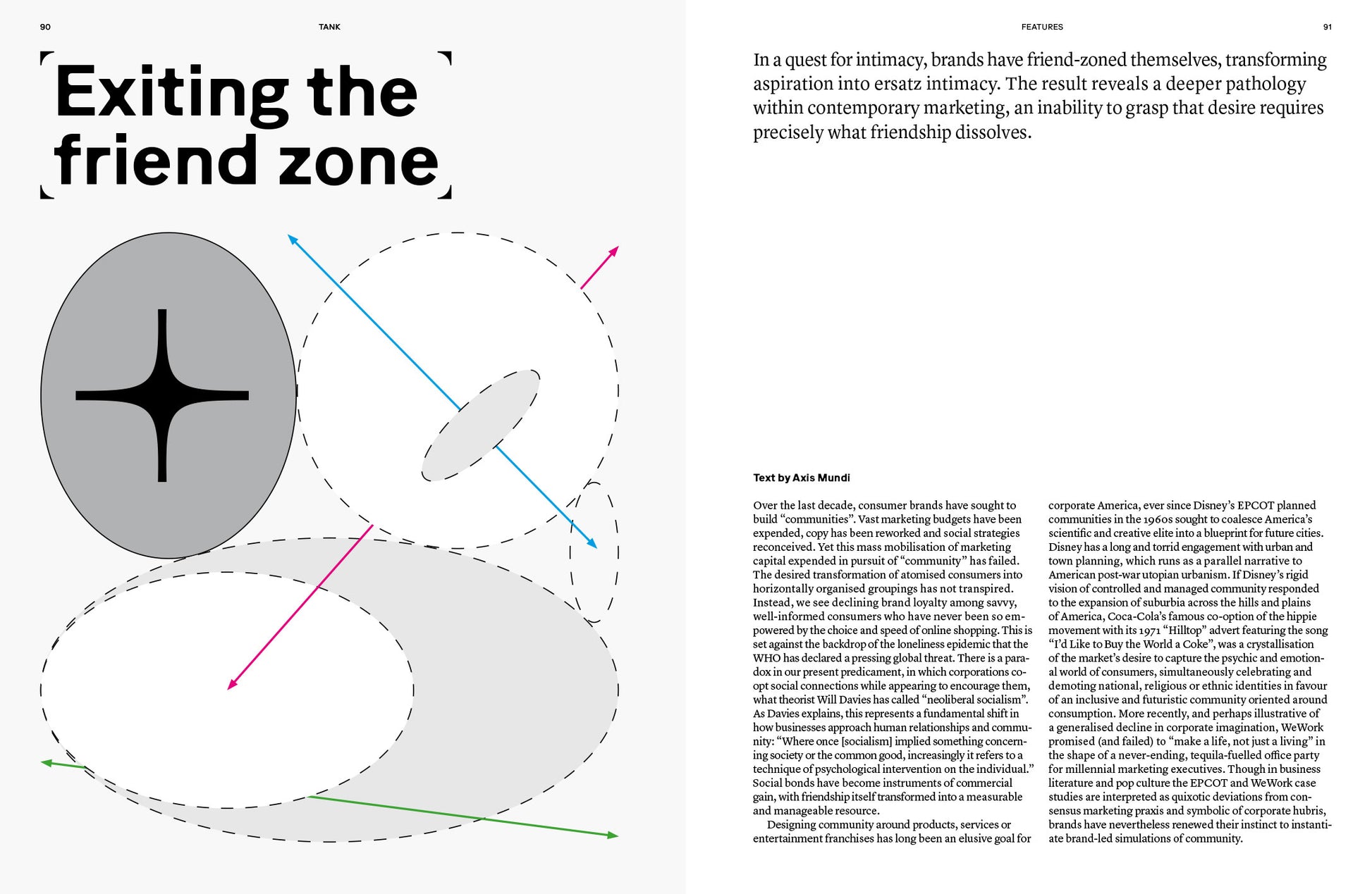 Semiotics studio Axis Mundi deciphers the role of community in corporate advertising, while Rosanna McLaughlin uncovers loneliness and transphobic handicrafts at the LGB Alliance Conference. Amy Ching-Yan Lam and Aurelia Guo reflect on the meaning of home, and Emily Steer examines the cult-like allure of the Landmark Forum. Francisco Garcia investigates the poison-pen letters causing chaos in rural Yorkshire, and we ask artists, theorists, and a dominatrix: what’s wrong with community?