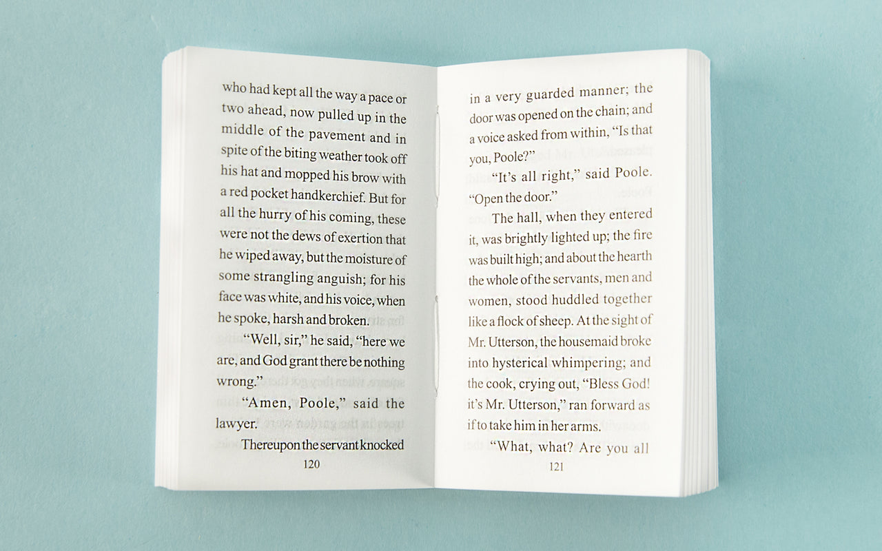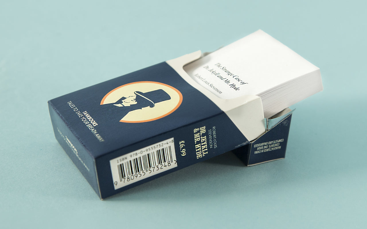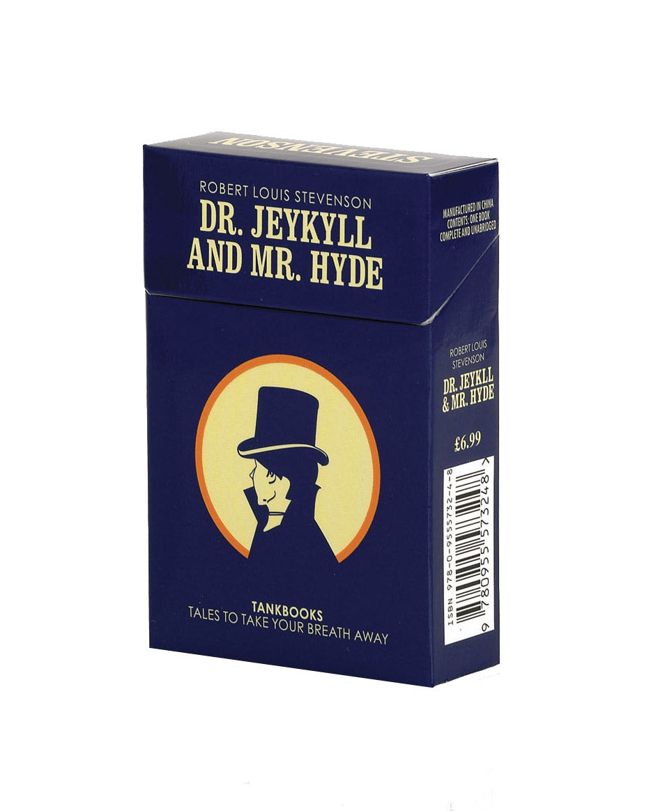 Cigarette pack edition of "Dr. Jekyll and Mr. Hyde" by Robert Louis Stevenson. The flip-top cigarette pack is one of the most successful pieces of packaging design in history. TankBooks pay homage to this iconic form by employing it in the service of great literature. We have launched a series of books designed to mimic cigarette packs – the same size, packaged in flip-top cartons with silver foil wrapping and sealed in cellophane. The titles are by authors of great stature – classic stories presented in classic packaging; objects desirable for both their literary merit and their unique design. Each story is complete and unabridged – with a type size that’s easy to read. Individual books are great for throwing into a pocket or handbag – an instantly familiar object to carry with you. The complete set comes in a stunning tin – perfect as a really original gift.