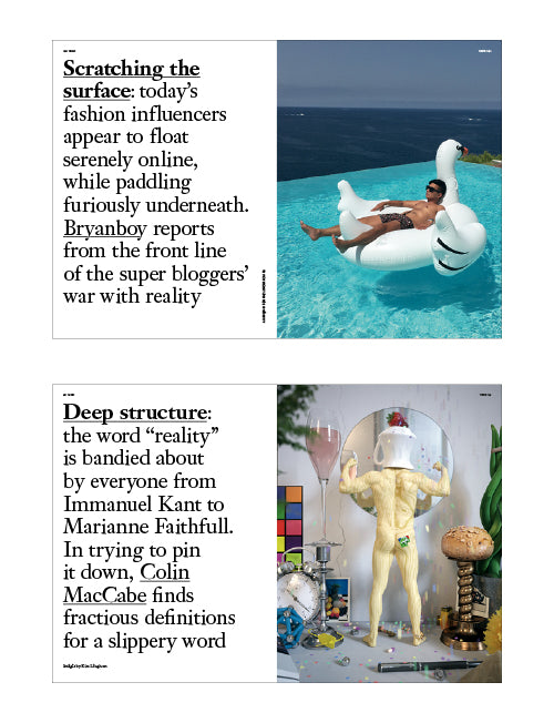 This issue examines the knotty nature of that numinous substance: reality. But instead of sticking to what we know, the issue ventures towards a vast territory of unknowables: nightmares, hallucinations, lies, delusions, fanaticism – realities that have been marred beyond recognition. With Colin McCabe, Deyan Sujic, Emily Sargent and Benjamin Bratton.